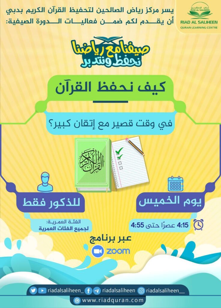 صيفنا مع رياضنا نحفظ ونتدبر يسر مركز رياض الصالحين لتحفيظ القرآن الكريم بدبي أن يقدم لكم ضمن فعاليات الدورة الصيفية: كيف نحفظ القرآن في وقت قصير مع إتقان كبير يوم الخميس الموافق 2021/7/1م الساعة 04:15 عصرًا للذكور فقط لجميع الفئات العمرية عبر برنامج zoom
