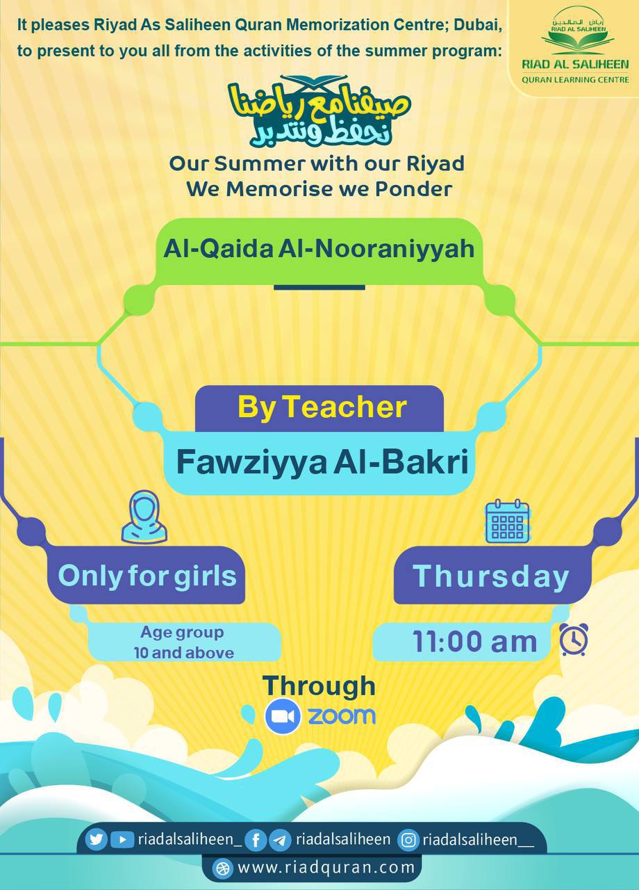 Our Summer with our RiyadWe Memorise we PonderIt pleases Riyad As Saliheen Quran Memorization Centre; Dubai, to present to you all from the activities of the summer program Al-Qaida Al-NooraniyyahBy Teacher: Fawziyya Al-Bakri 🗓 Thursday 🕰 11.00 am Only for girls Age group- 10 and above Through zoom